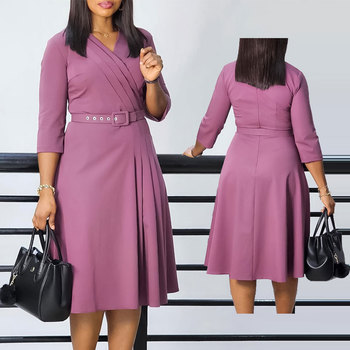 ATR-507 abito Midi a mezza manica con scollo a V Plus Size traspirante in tessuto elasticizzato plissettato Casual da ufficio