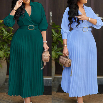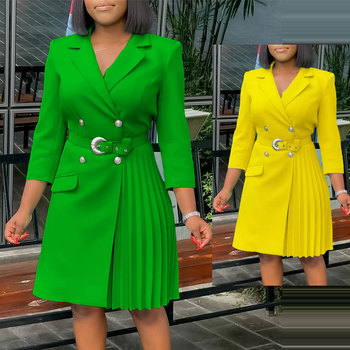 Bayanlar ofis elbiseler kadınlar Trendy zarif pileli düz boyalı Patchwork uzun kollu pileli Suit yaka kemer rahat yaz güz