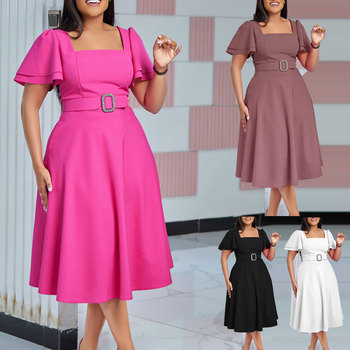 Zarif ofis bayanlar yaz Midi son tasarım kare yaka yüksek bel Flare kollu katı desen kemer rahat düz boyalı